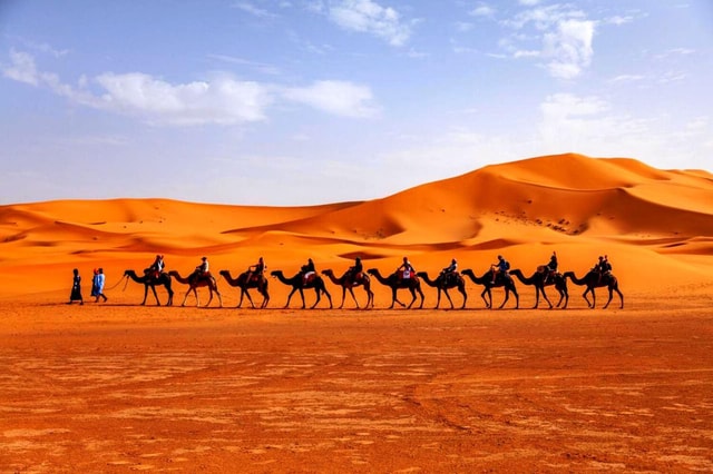Découvrez la magie du désert de Merzouga lors d'un voyage de 3 jours au départ de Marrakech. Montez à dos de chameau, admirez de superbes couchers de soleil et dormez sous les étoiles dans un campement bédouin pour une aventure inoubliable dans le désert.