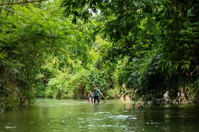 Profitez d'une expérience paisible de rafting en bambou près de Khao Lak. Flottez le long d'un ruisseau calme dans la jungle, entouré d'une végétation luxuriante, de palmiers et d'animaux sauvages.