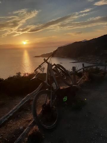 Il tour prosegue verso il promontorio di Capo di Stella, immerso nei profumi e nei colori intensi della macchia mediterranea. Una breve e piacevole salita ci condurrà su una strada panoramica in quota, da cui potremo ammirare i diversi versanti dell’Isola d’Elba, baciati dalla luce del tramonto. Ritorno al crepuscolo, accendendo la luce sulla bici (se c'è bisogno), verso il punto di partenza (Elba MTB Lacona).