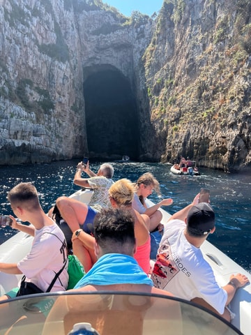 Parti per un'avventura in motoscafo alla Grotta Blu di Valona. Scopri l'affascinante bagliore blu, le formazioni rocciose uniche e il Parco Marino, le spiagge vicine e Grama Bay.