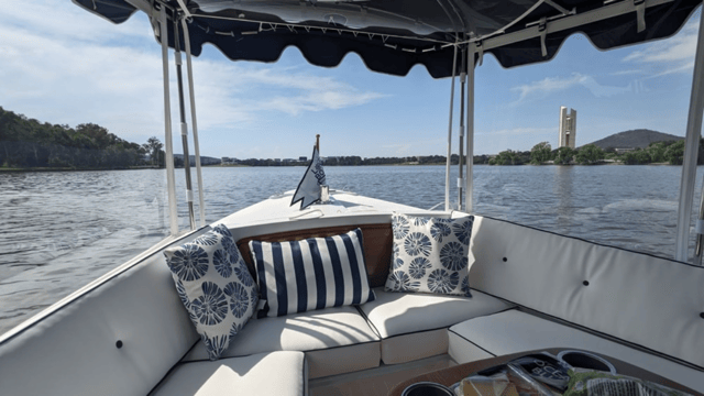 Diventa il capitano della tua barca elettrica sul lago Burley Griffin a Canberra. Naviga in tutta comodità con un tettuccio completamente chiuso, uno stereo Bluetooth e un frigorifero integrato per cibo e bevande.