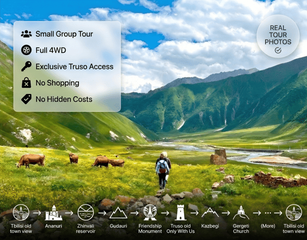 Lasciati alle spalle Tbilisi per intraprendere un'emozionante avventura in montagna in fuoristrada. Attraversa la regione di Kazbegi e la valle di Truso, esplora geyser e fiumi e ammira lo straordinario villaggio di Stapantsminda.