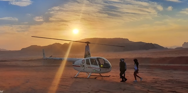 Vola da Amman a Wadi Rum in elicottero. Ammira i paesaggi della Giordania dall'alto, trascorri la notte in un accampamento nel deserto e goditi un volo panoramico di ritorno il giorno successivo.