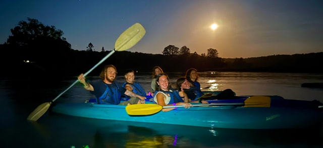 Peddel onder de maanverlichte hemel tijdens een kanotocht bij volle maan. Geniet aan het einde van de tour van een glas champagne of sap en luister naar de nachtelijke roep van wilde dieren.
