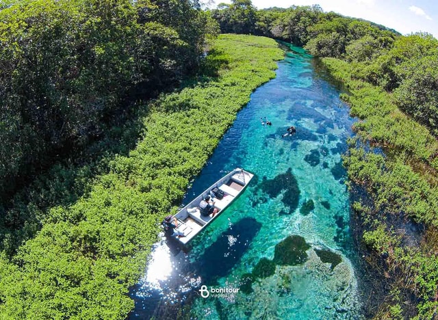 Deze gigantische aquariumervaring bestaat uit twee delen: een pad door het weelderige, tropische oeverbos en een 2 uur durende waterreis (2 km stroomafwaarts snorkelen) langs de verbazingwekkend heldere Olho d'Água-rivier, die samenkomt met de grotere en iets minder transparante Prata rivier (600 meter snorkelen). Er is ook de mogelijkheid om te duiken in de Prata-rivier. De ranch biedt ook andere activiteiten: paardrijden door de velden van de boerderij en vogels kijken met 200 geregistreerde soorten. De ecotoeristische attractie heeft prijzen gewonnen voor zijn compromis met de veiligheid, kwaliteit en natuurbehoud van de bezoeker.