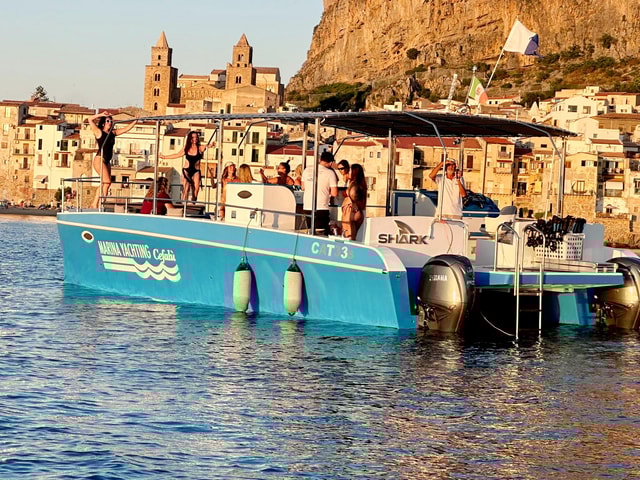 Cefalù: tour in mini-jacht met grotten, snorkelen en aperitief open bar