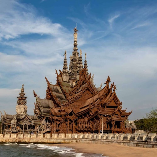 Bezoek Pattaya's Sanctuary of Truth - een prachtige houten tempel aan zee. Bewonder het ingewikkelde houtsnijwerk en dompel jezelf onder in het Thaise erfgoed.