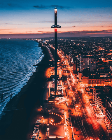 Ervaar Brighton vanaf 137 meter hoogte tijdens een City Lights Flight. Geniet van een welkomstdrankje van de skybar en geniet van het gloeiende uitzicht op de stad en de kust eronder.