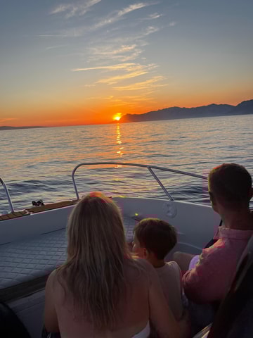 Dołącz do nas na 90-minutową wycieczkę łodzią motorową o zachodzie słońca z Makarskiej, w tym postój na kąpiel w ukrytej zatoce na wyspie Brač, z małą grupą (do 12 osób).