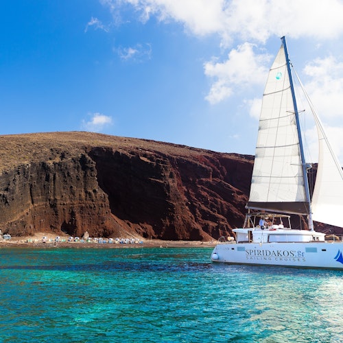 Wypłyń w zachód słońca na Santorini podczas 5-godzinnego rejsu na pokładzie katamaranu. Ciesz się świeżo ugotowaną kolacją z grilla z winem i napojami bezalkoholowymi. Pływaj i nurkuj z rurką przy pięknej czerwonej i białej plaży.