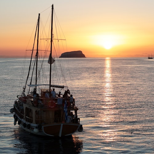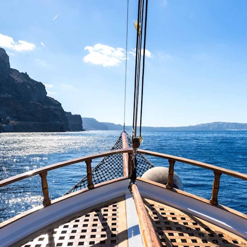 Wybierz się na wycieczkę łodzią na Santorini, delektuj się pysznym posiłkiem, nurkuj w przejrzystych wodach i opalaj się na pokładzie. Popłyń do kaldery, aby poczuć energię wulkanu i popływać w jego gorących źródłach.