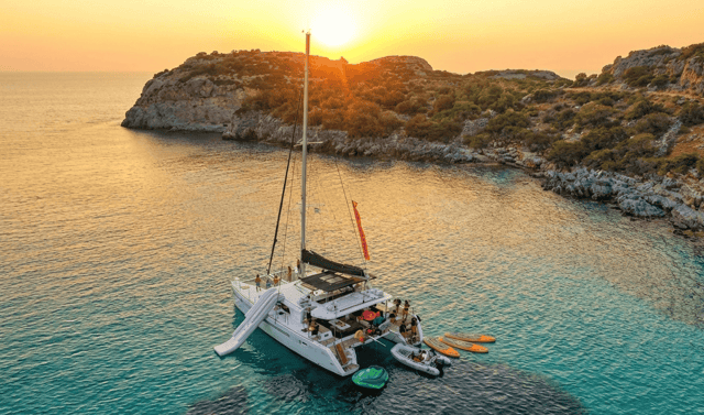 Luksusowy katamaran o zachodzie słońca na Rodos z otwartym barem i zabawkami wodnymi