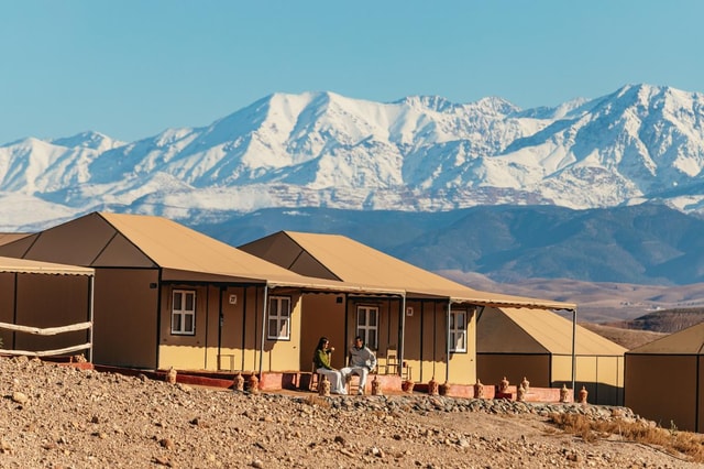 Prześpij się w obozie pod gwiazdami podczas całonocnej wycieczki z Marrakeszu na pustynię Agafay. Ciesz się pysznym 3-daniowym posiłkiem, tradycyjnym marokańskim pokazem i podziwiaj spektakularny wschód słońca nad wydmami.
