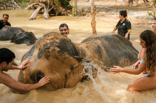 Wykreśl kąpiel ze słoniami ze swojej listy życzeń dzięki biletowi na kąpiel słoni w schronisku dla słoni Krabi. Pływaj, kąp się i bierz prysznic z przyjaznymi słoniami w tym etycznym sanktuarium.