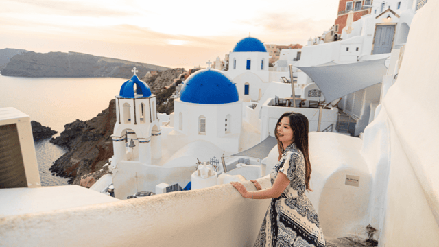 Capture as suas memórias de Santorini com uma sessão fotográfica na bela vila de Oia. Desfrute de orientação profissional com os icónicos edifícios caiados de branco e igrejas com cúpulas azuis como pano de fundo.