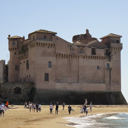 Uma praia com um castelo medieval e algumas ruínas romanas